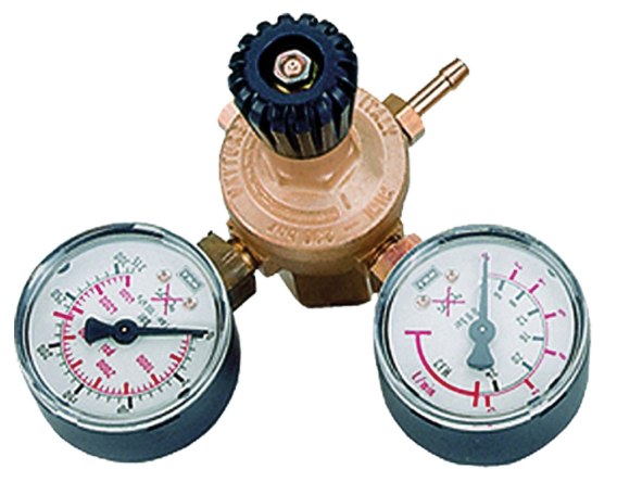 Reduktor wyposażony jest w dwa wskaźniki. Jeden wskazujący ciśnienie w butli a drugi, ustawiony przepływ gazu. Skala wskaźnika przepływu 0-12 l/min 0-24 CFM* Wypływ gazu reguluje się podczas wciśniętego przycisku palnika urządzenia spawalniczego. Skala wskaźnika ciśnienia to 0 - 315 bar / 0-4500 psi.