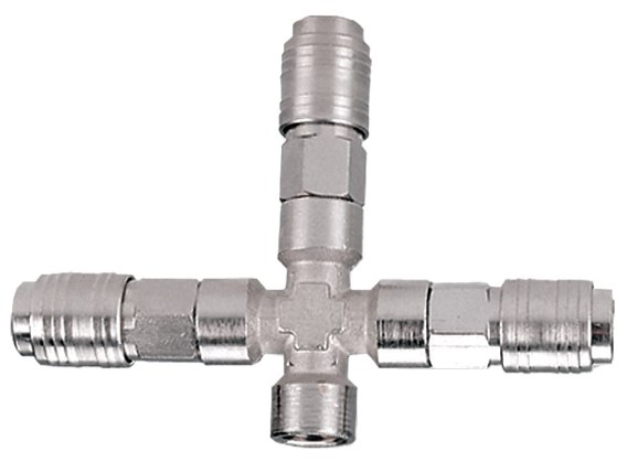 Profesjonalny trójnik stalowy. Trójnik to rozdzielacz z zamontowanymi szybkozłączami, umożliwiającymi korzystanie z trzech narzędzi pneumatycznych przy jednej krańcówce instalacji pneumatycznej lub na przykład montaż bezpośrednio na zbiorniku sprężarki.