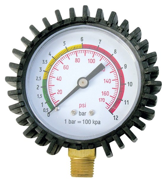 Wskaźnik ciśnienia pistoletu do pompowania boczny. Średnica manometru to 63 mm, posiada czytelną kolorową skalę. Manometr posiada gumową osłonę zabezpieczającą przed przypadkowymi uszkodzeniami mechanicznymi.