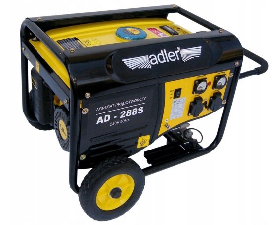 Agregat prądotwórczy AD-288S charakteryzuje się wysoką jakością wykonania. Mocna rama urządzenia oraz duże koła transportowe sprawiają, że urządzenie sprawdzi się znakomicie na wszelkiego rodzaju budowach czy dużych remontach zewnętrznych. Agregat AD-288S wyposażony jest w uproszczony moduł AVR - automatyczna regulacja napięcia, zabezpieczający podłączone urządzenia, nie zaleca się podłączanie delikatnego sprzętu elektronicznego. AD-288S posiada także czujnik przeciążenia zapobiegający uszkodzeniu urządzenia. Urządzenie posiada amperomierz i woltomierz oraz dwa gniazda 230V. AD-288S wyposażony jest zarówno w rozruch ręczny (linka) jak i rozrusznik elektryczny uruchamiany przełącznikiem. *Akumulatory niezbędne do działania elektrycznego rozrusznika nie są dołączone do urządzenia.