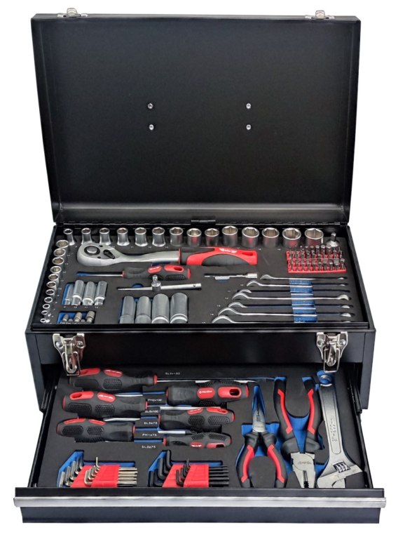 Komplet znajduje się w wytrzymałej metalowej skrzynce narzędziowej z szufladą na mocnych prowadnicach.