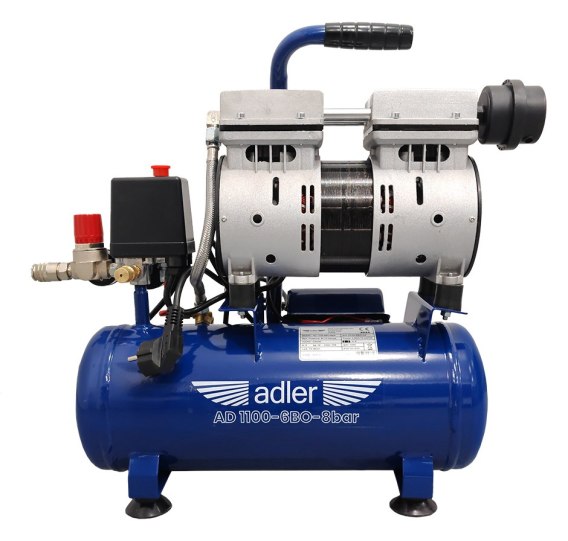 ADLER AD1100-6BO SILENT 230V – bezolejowa, dwucylindrowa sprężarka 8 bar ze zbiornikiem 6 l. Wydajność praktyczna 105 l/min (przy 6,3 bar), niski hałas 78 dB. Do pompowania, przedmuchu i lekkiej pneumatyki; obsługa bez oleju, tylko spuszczanie kondensatu.