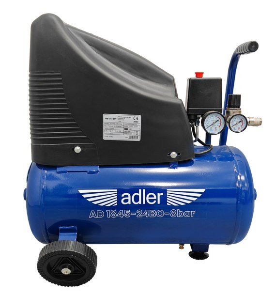 ADLER AD1845-24BO 230V – bezolejowy kompresor 8 bar ze zbiornikiem 24 l. Wydajność praktyczna 118 l/min (przy 6,3 bar), moc 1,1 kW. Do pompowania, przedmuchu i podstawowych prac warsztatowych; obsługa bez oleju, tylko spuszczanie kondensatu.