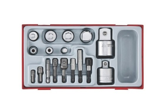 Zestaw zawierający 17 różnych łączników pośrednich (adapterów) do narzędzi z chwytami 1/4", 3/8", 1/2" i 3/4". Dostarczany w pojemniku z tworzywa sztucznego z odłączaną pokrywą. Pasuje do skrzynek i wózków narzędziowych Teng Tools.